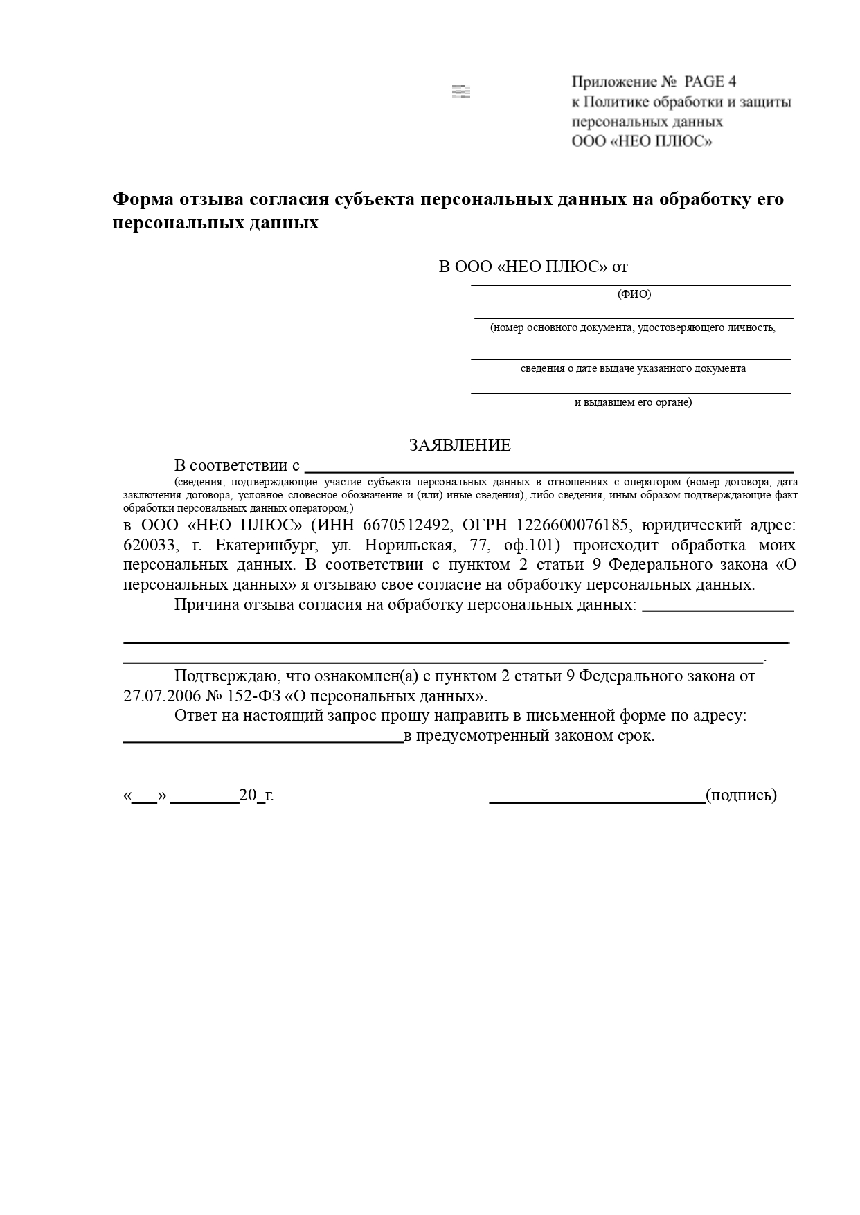 6.11. Для отзыва согласия Субъекта персональных данных на обработку его персональных данных субъекту (либо законному представителю) необходимо заполнить соответствующую форму отзыва согласия субъекта персональных данных на обработку его персональных данных (приложение 4 или 8) и передать лично работникам ООО «НЕО ПЛЮС», принимающим обращения граждан, либо по почте. В случае отзыва согласия на обработку персональных данных ООО «НЕО ПЛЮС» вправе продолжить обработку персональных данных без согласия субъекта персональных данных при наличии оснований, указанных в пунктах 2 - 11 части 1 статьи 6, части 2 статьи 10 и части 2 статьи 11 Федерального закона от 27.07.2006 № 152-ФЗ «О персональных данных».