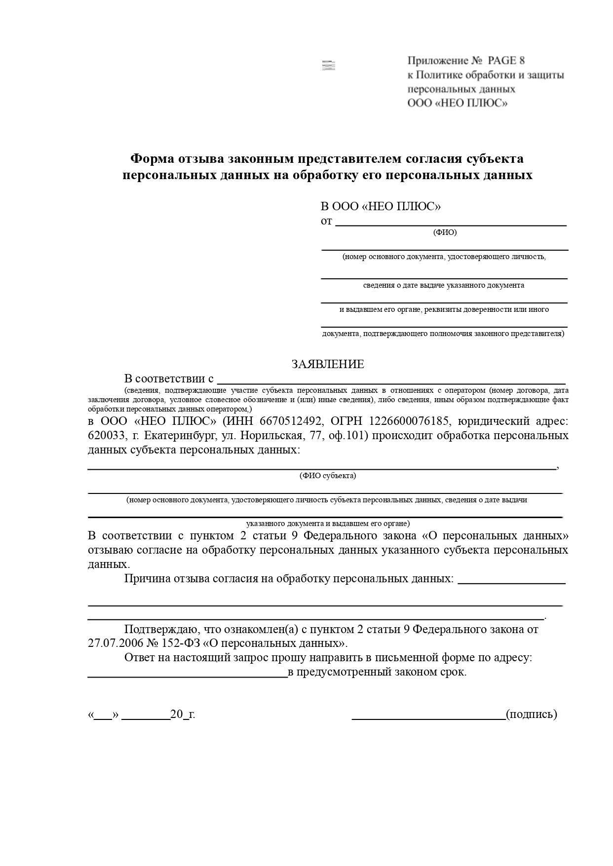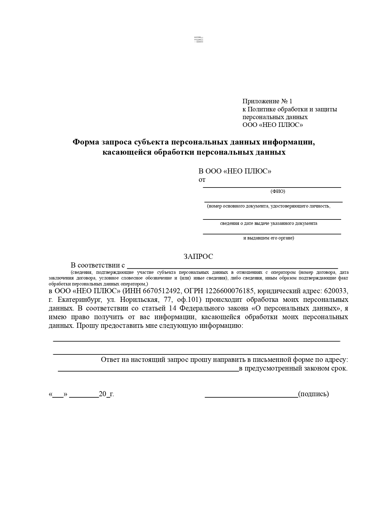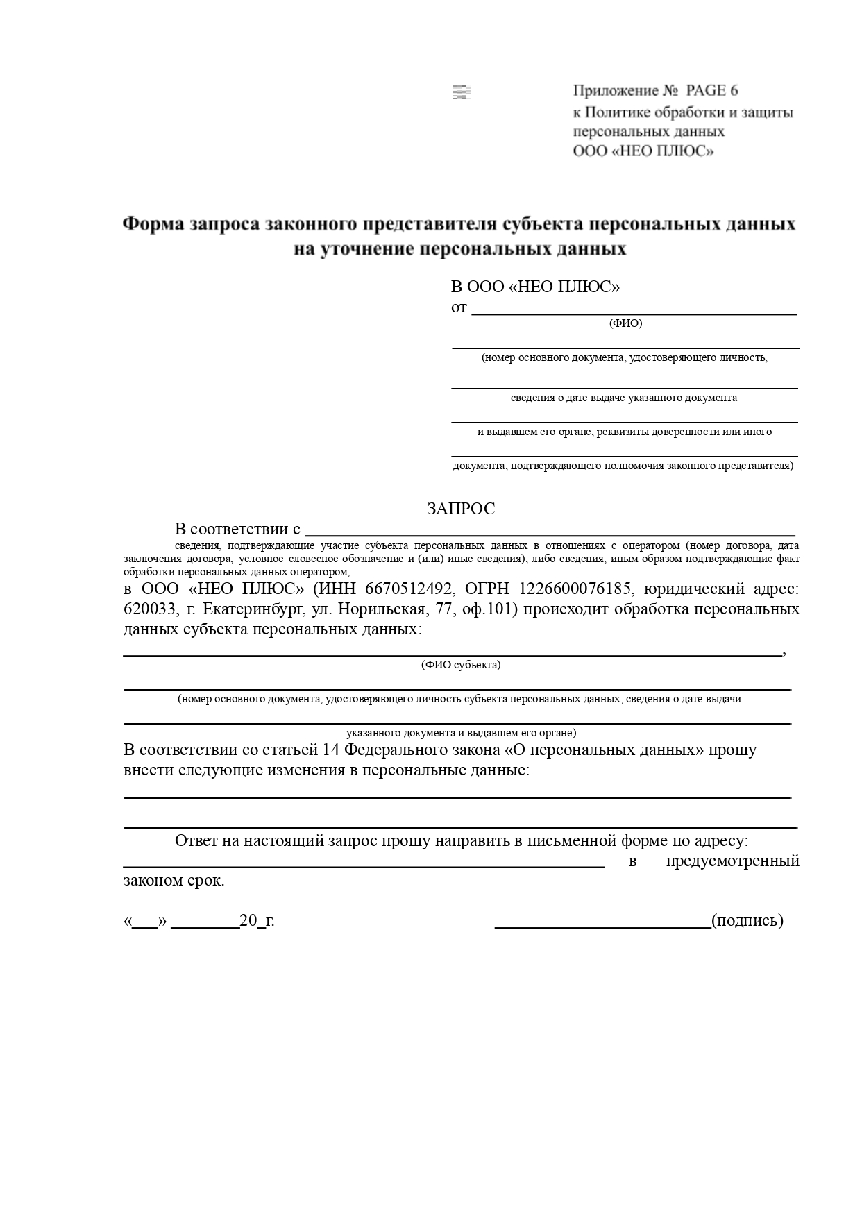 6.8. Для получения необходимой информации, касающейся обработки персональных данных, описанной в пункте 6.5.1. настоящей Политики, Субъекту (либо законному представителю) необходимо заполнить соответствующую форму запроса субъекта персональных данных информации, касающейся обработки персональных данных (приложение 1 или 5) и передать лично работникам ООО «НЕО ПЛЮС», принимающим обращения граждан, либо по почте.