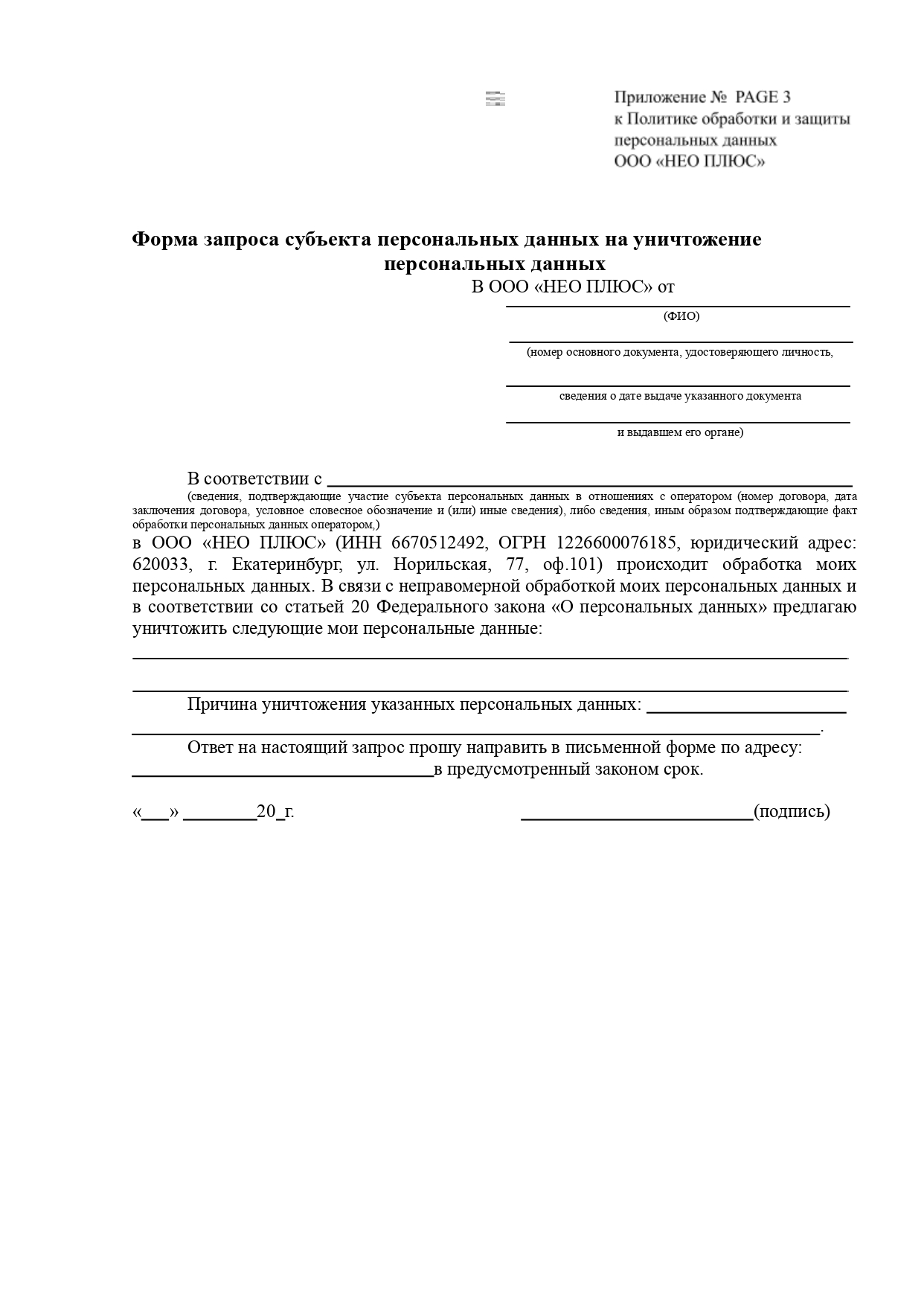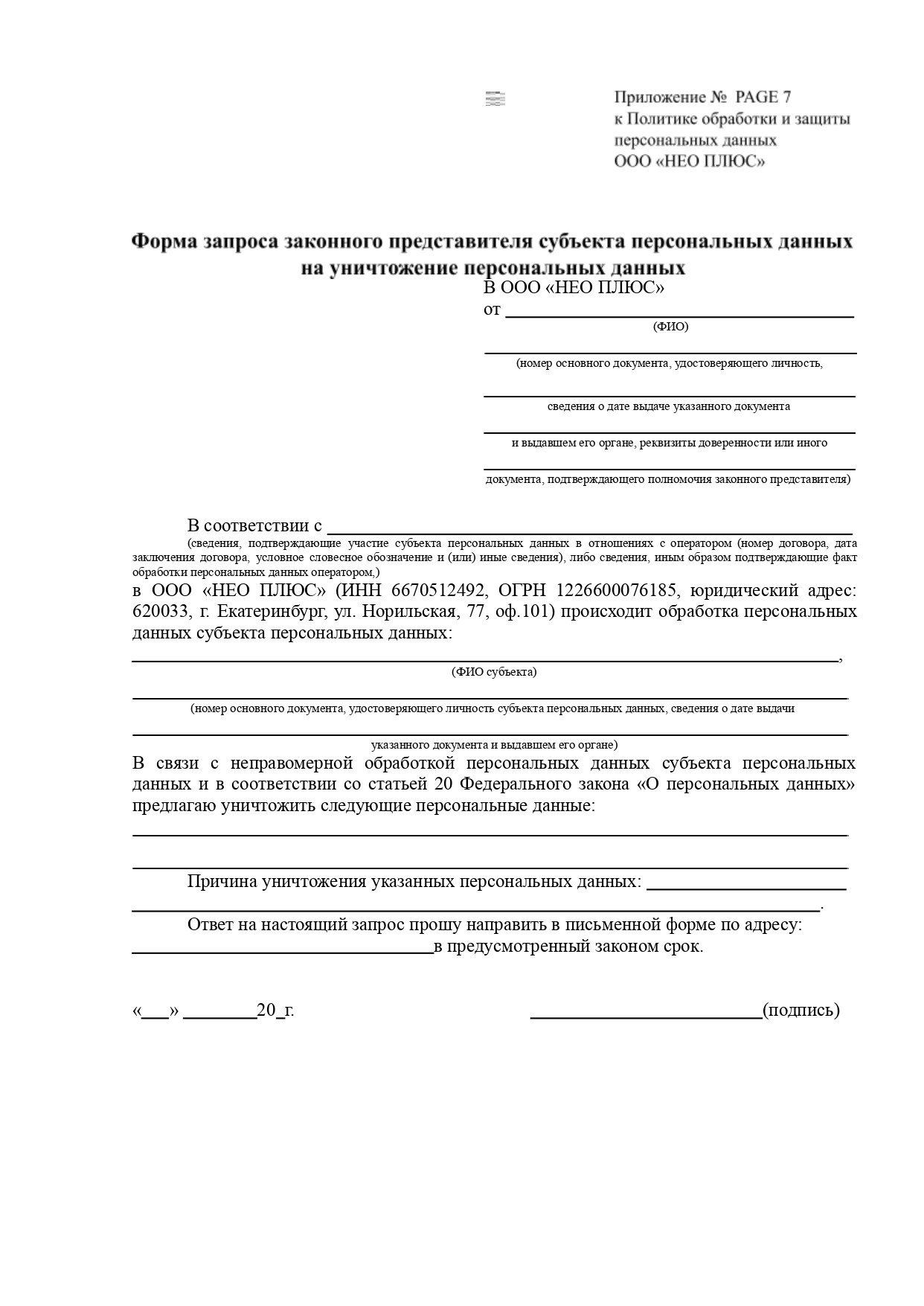 6.10. Для исключения неправомерности обработки персональных данных Субъекту (либо законному представителю) необходимо заполнить соответствующую форму запроса субъекта персональных данных на уничтожение персональных данных (приложение 3 или 7) и передать лично работникам ООО «НЕО ПЛЮС», принимающим обращения граждан, либо по почте.
